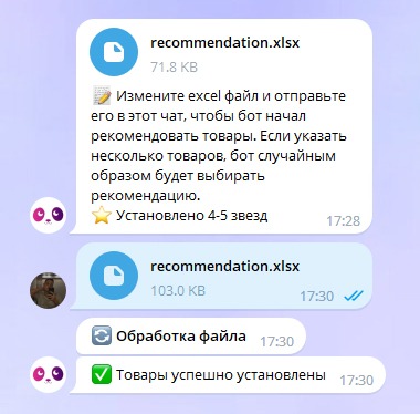 Настройка рекомендаций происходит через excel файл и разными вариантами его заполнения. Каждый артикул на новой строчке. Если к одному товару подходит несколько рекомендаций, бот выберет один случайным образом.