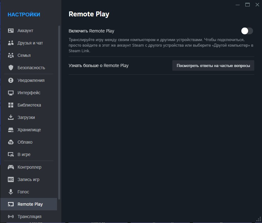 Левый верхний угол -> Steam -> Настройки -> Remote Play выкл.