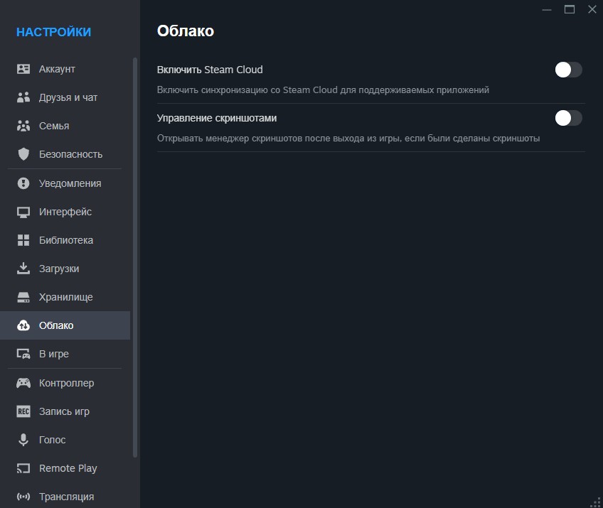Левый верхний угол -> Steam -> Настройки -> Облако -> Включить Steam Cloud -> Переводим ползунок в неактивное положение (как на скриншоте)