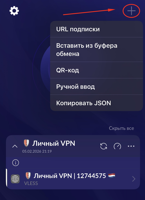 Добавить VPN ключ в приложение Happ: