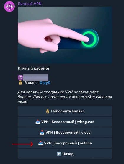 9. Открываем наш телеграм бот, нажимаем «меню» - «аккаунт» и выбраем конфигурацию «Outline»