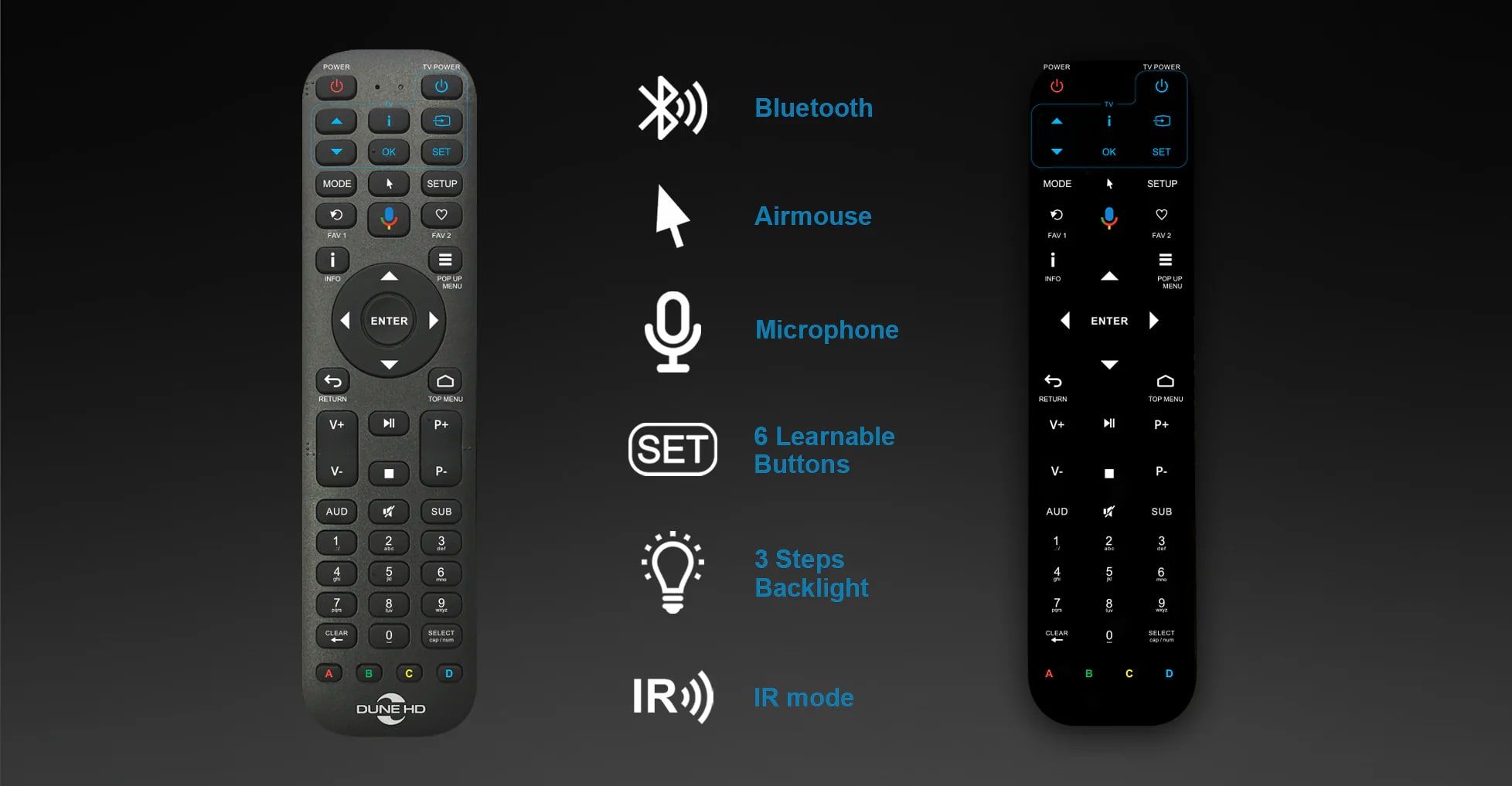 Dune Remote R4 - это фирменный Bluetooth - пульт дистанционного управления от компании Dune HD. Работает он от двух батареек типа ААА и включает в себя следующие функции: