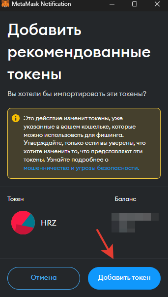 Теперь жмем "Добавить HRZ в кошелек" и подписываем контракт: