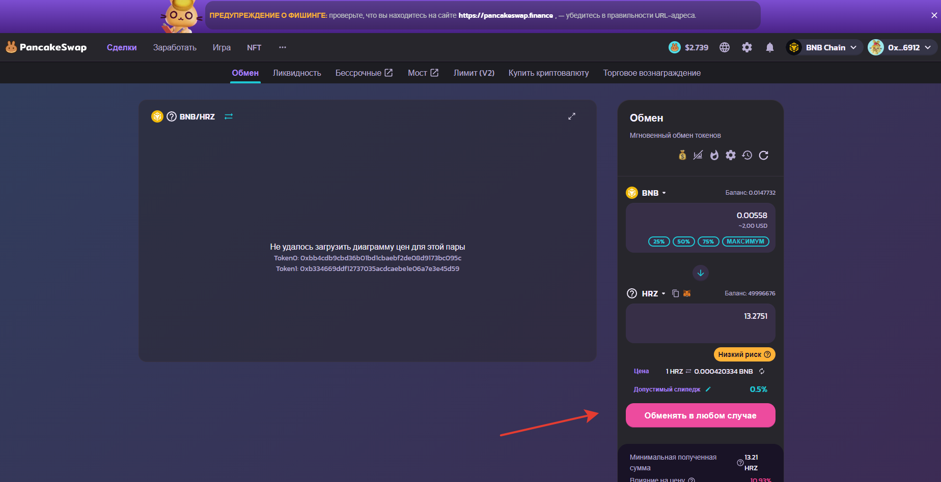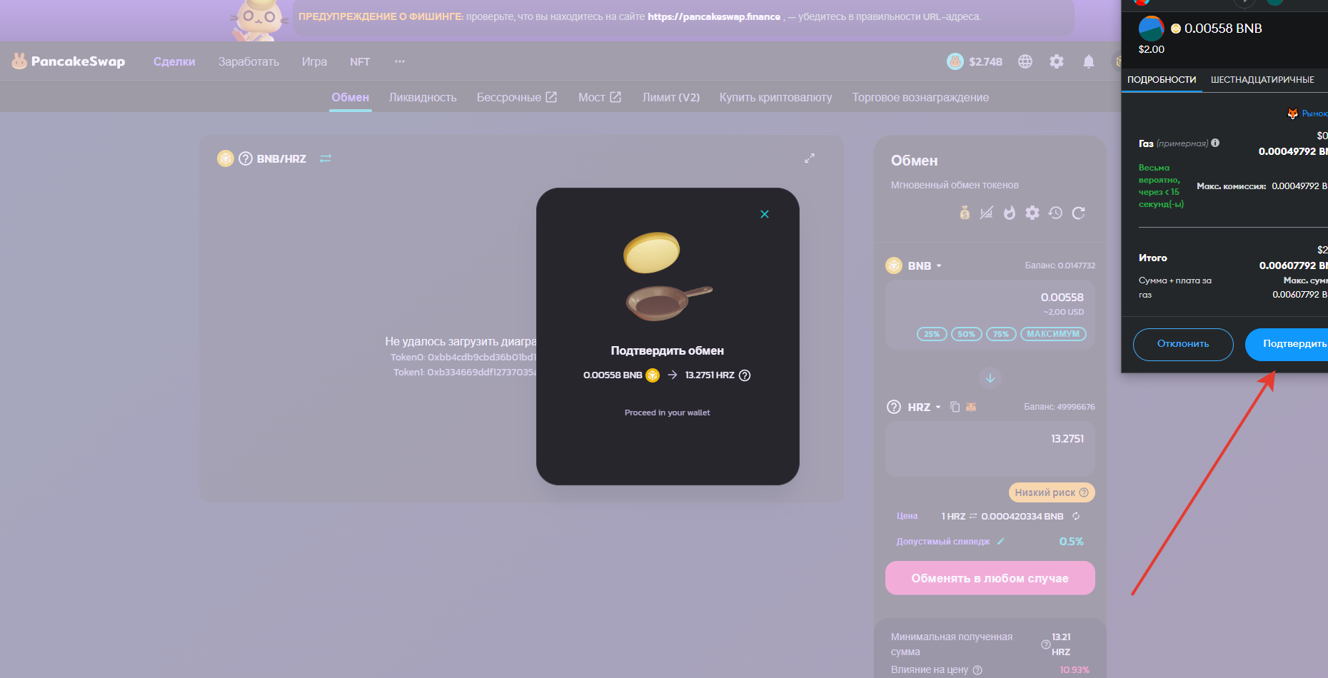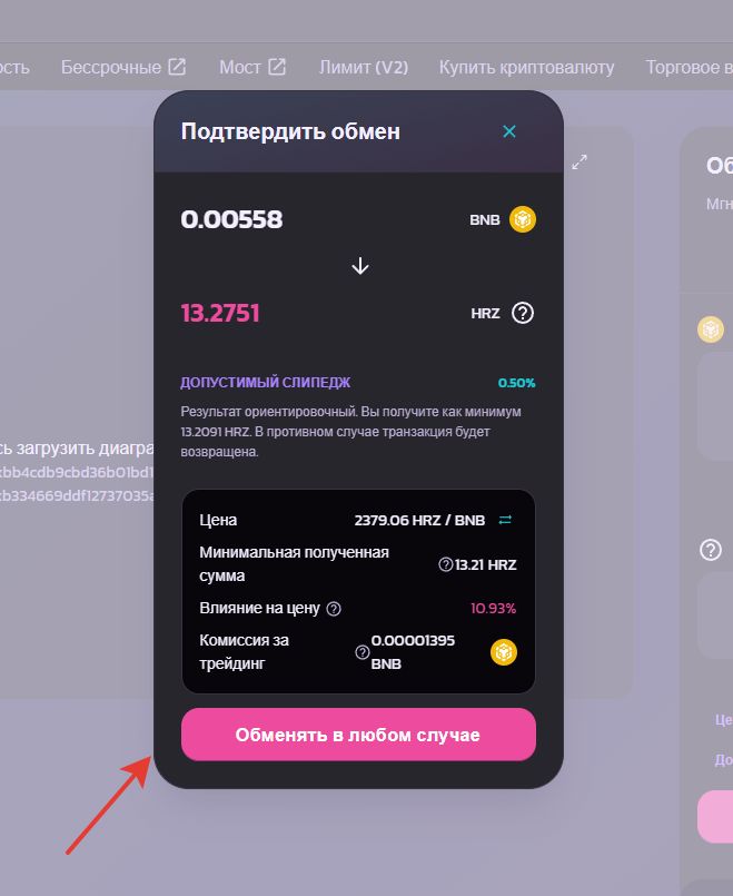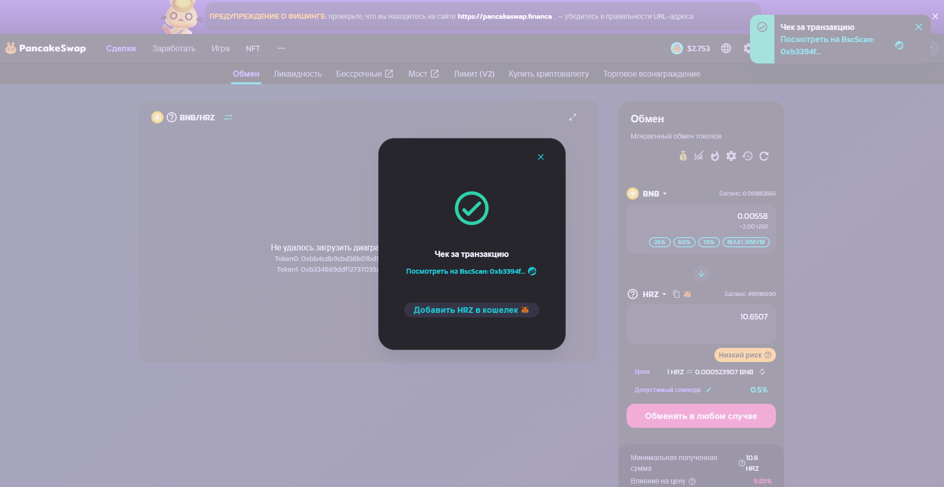 После всех подтверждений у вас должны списаться BNB и зачислиться HRZ, также в Pancake swap придет чек: