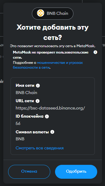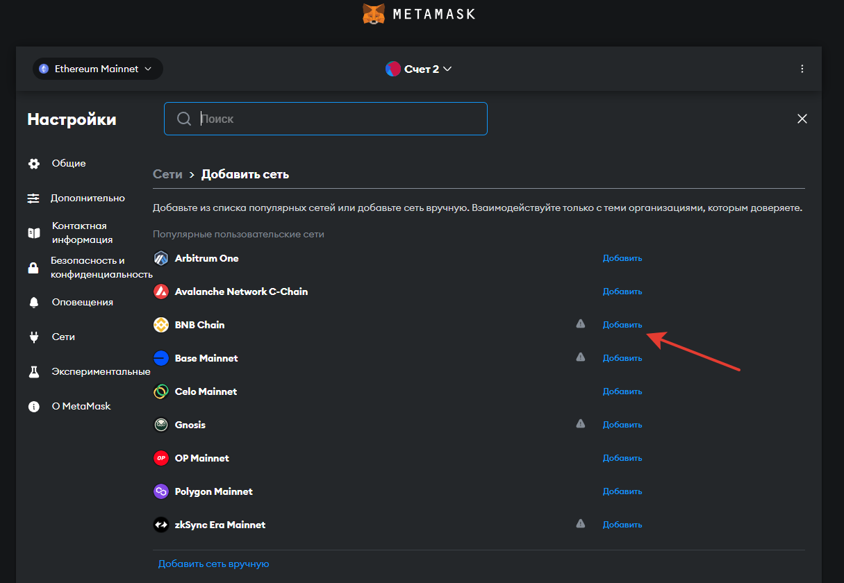Тут мы нажимаем на кнопку "Добавить", около сети BNB Chain, далее нам вылезет такое меню: