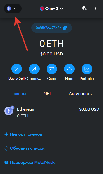 Чтобы подключить сеть BNB chain, вам надо нажать на значок Ethereum в левом верхнем углу: