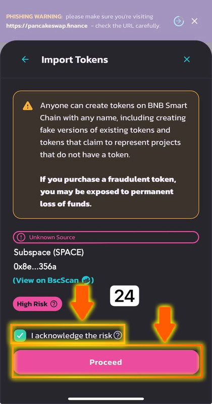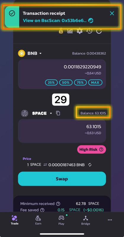 Также учтите, что из-за нагрузки на сеть BSC покупка может не пройти с первого раза. Повторите попытку 2-3 раза, следуя инструкциям, и вы сможете успешно приобрести Subspace (SPACE).