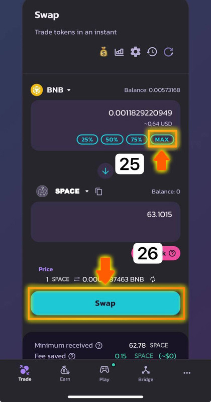 25)Указываем сумму для обмена на Subspace (SPACE).