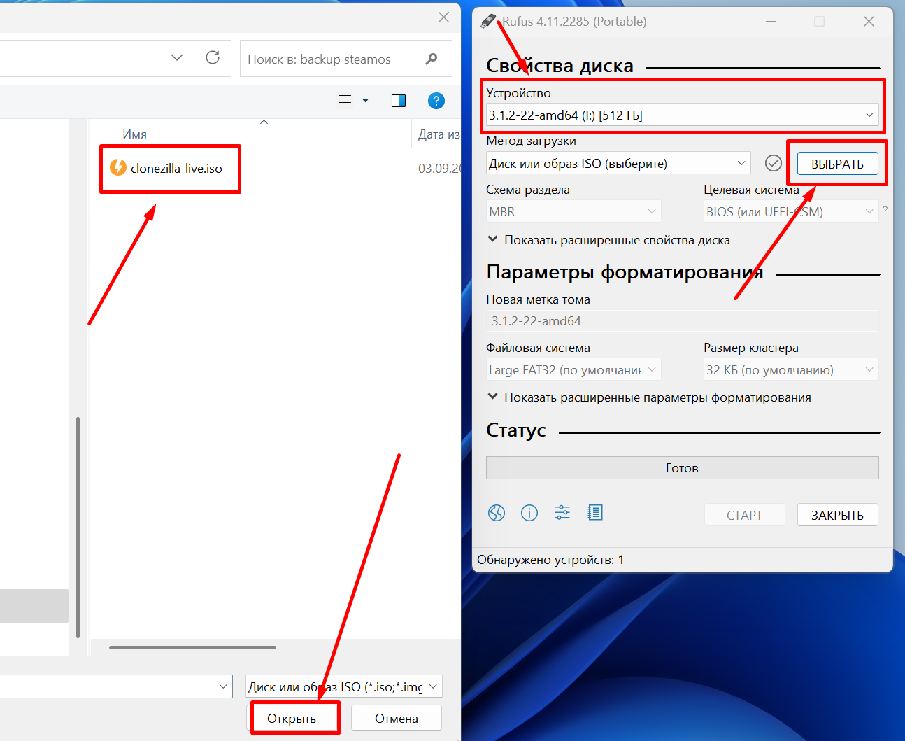 - Выбираем в графе Устройство свою флешку и нажимаем Выбрать, после выбираем образ и нажимаем Открыть