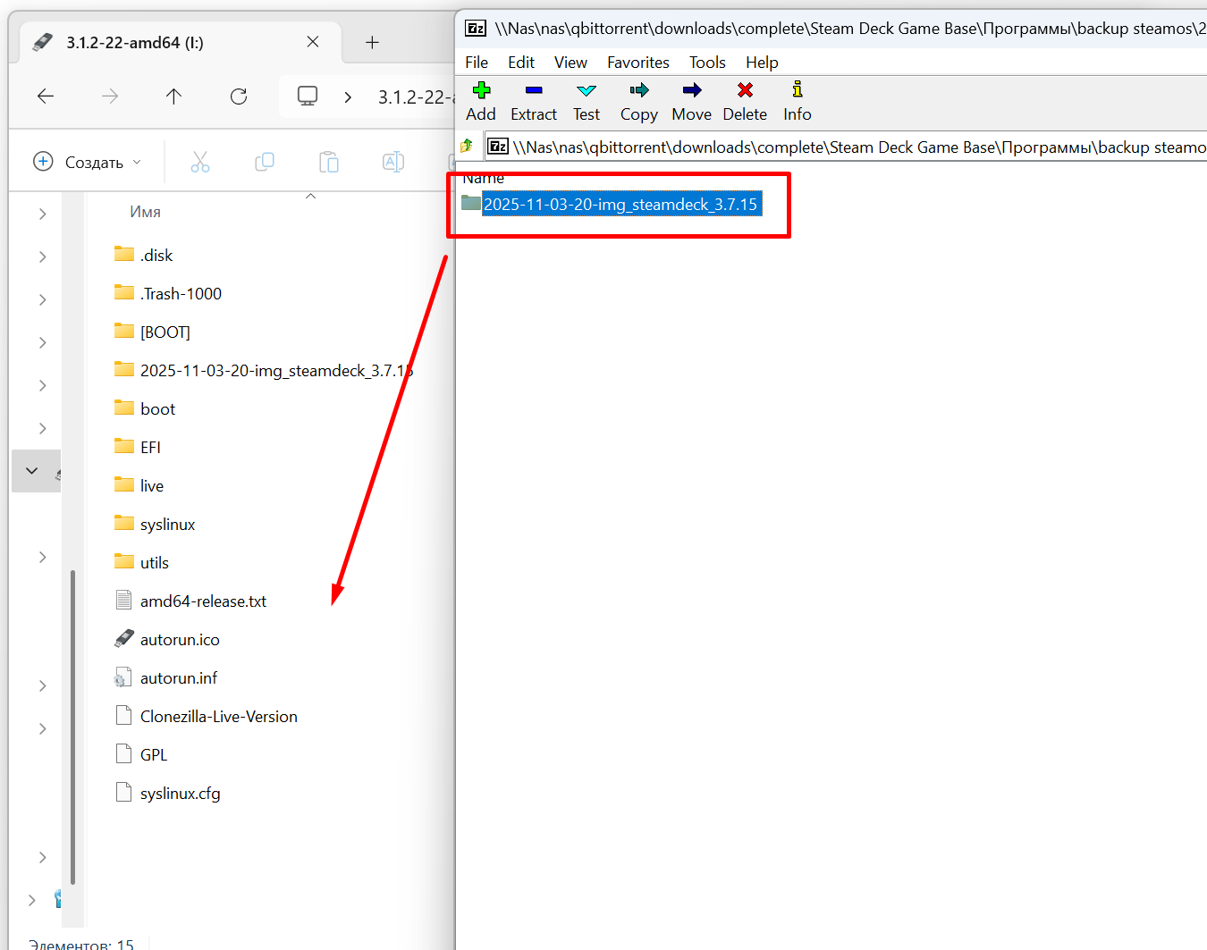 - Распаковываем папку из архива 2025-11-03-20-img_steamdeck_3.7.15.7z на флешку