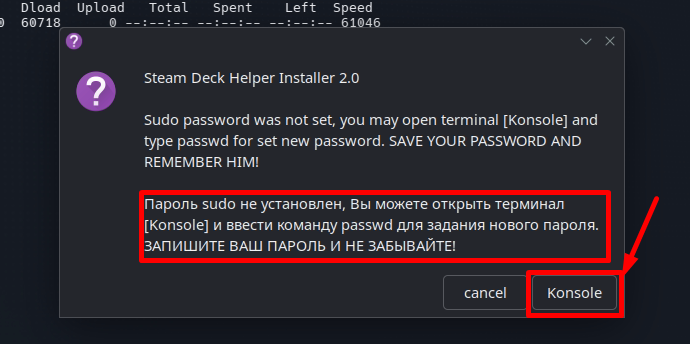 - Если у вас не задан пароль sudo инсталлятор предложит его Установить, открываем Konsole по кнопке и следуем указаниям написанным в инсталляторе.