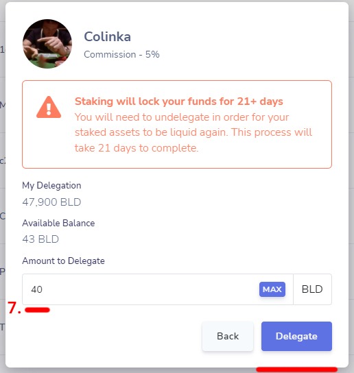 8. После указания количества токенов нажмите кнопку "Delegate"