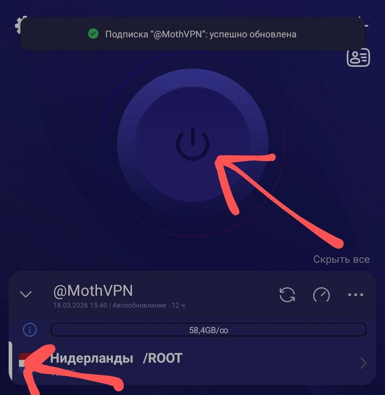Нажмите по подписке (на примере это Нидерланды), она должна выделиться сбоку белой полосой. Затем нажмите на большую кнопку включения в верхней половине приложения