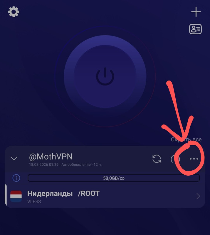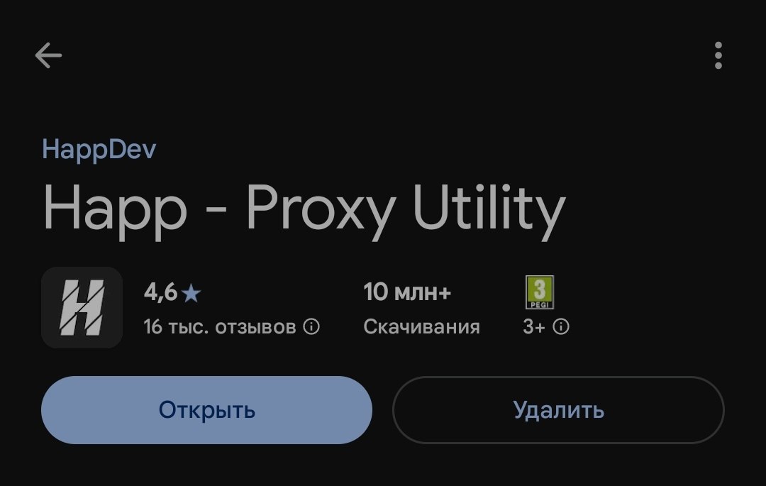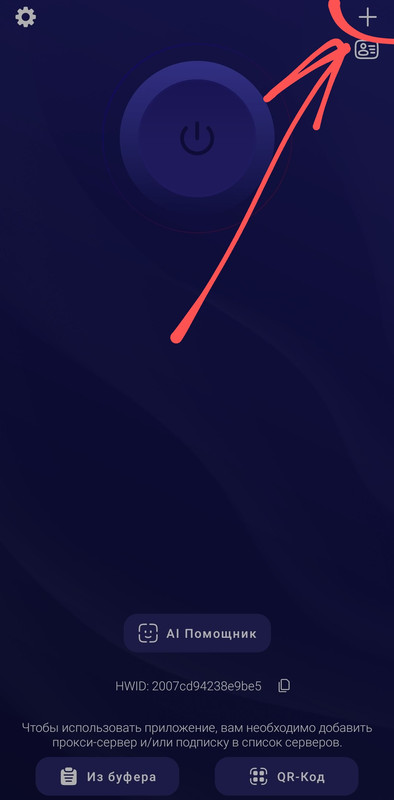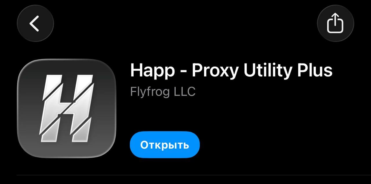 Открываем Happ. Нажимаем на иконку "+" в правом верхнем углу