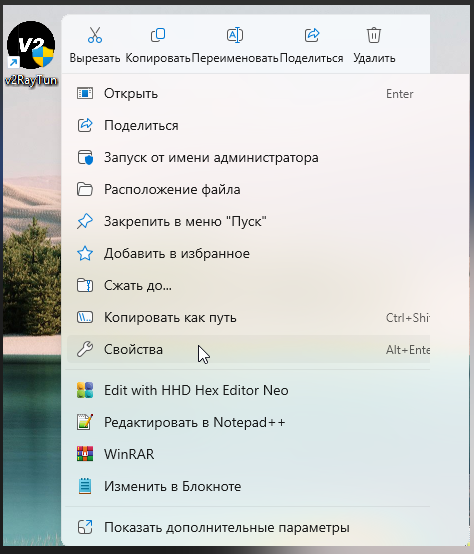- На рабочем столе появится иконка v2RayTun — щёлкните по ней правой кнопкой мыши, зайдите в «Свойства» → «Совместимость» и включите опцию «Запуск от имени администратора»