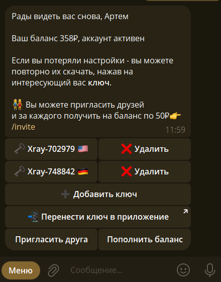 4. Добавление ключа. Идем в чат бот @VPN_OpenWorld_bot меню - Главное меню