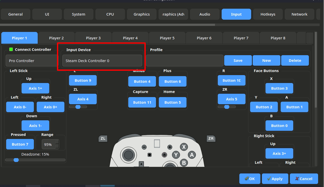 - Переходим в Emulation - Configure... эмулятора во вкладку Input и выставляем в графе Input Device - Steam Deck Controller 0