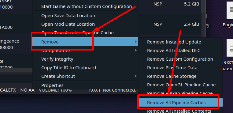 - Необходимо очистить кэш шейдеров, для этого нажимаем L2 по игре в окне эмулятора, выбираем Remove - Remove All Pipeline Cashes