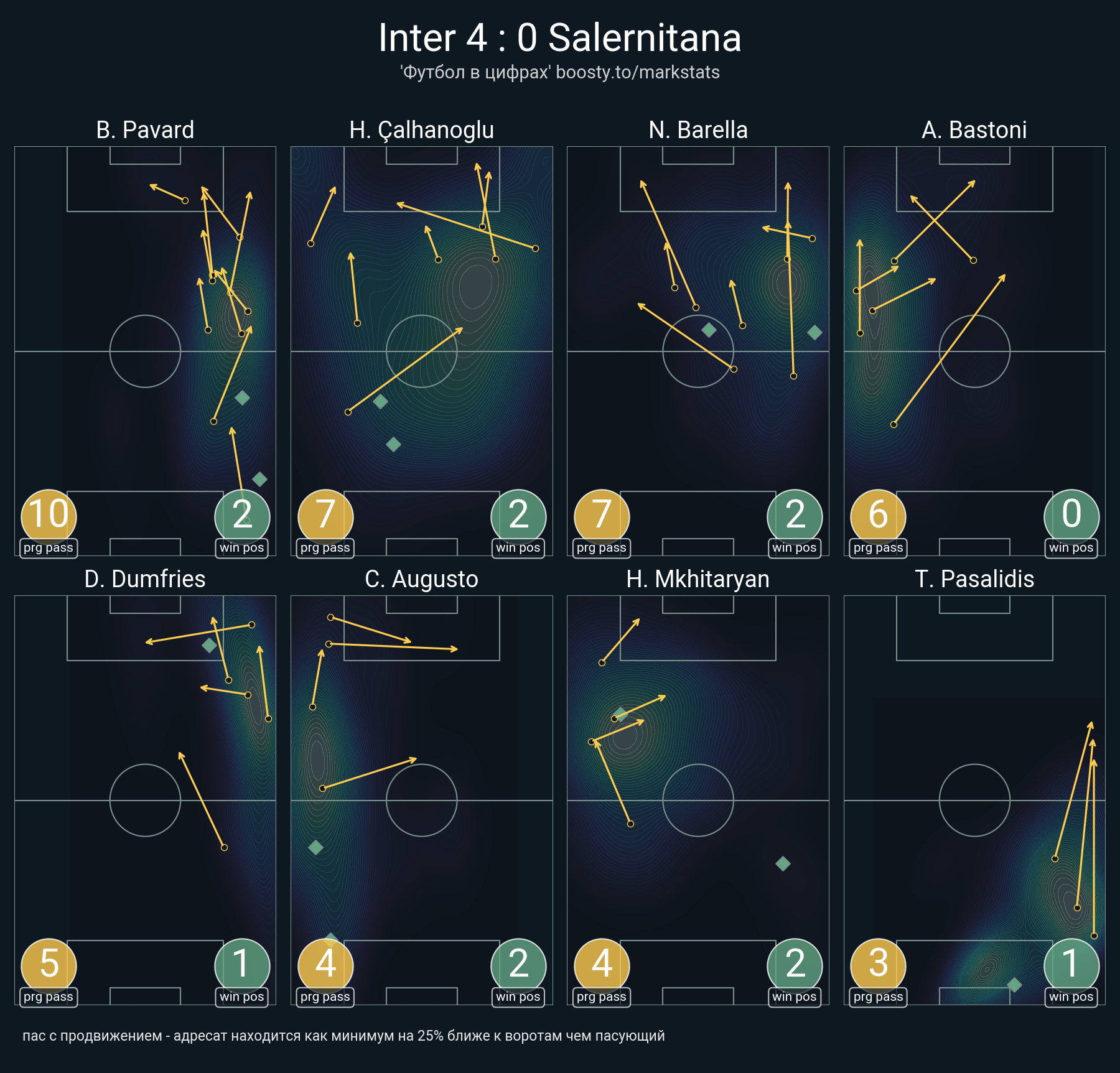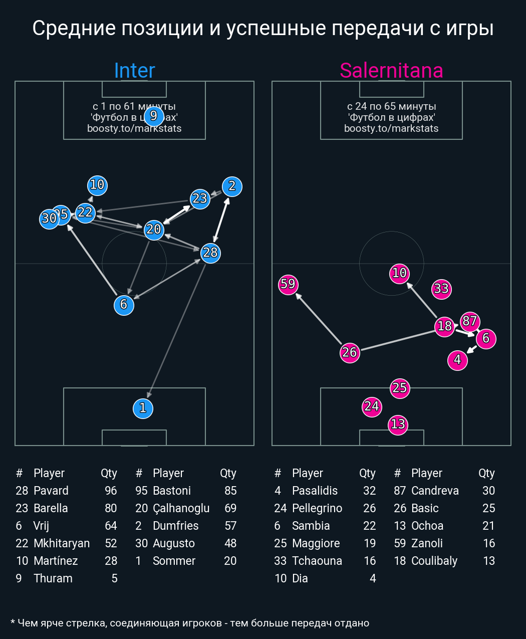 60 успешных передач из 64 попыток (1 с продвижением, 1 на трети соперника)