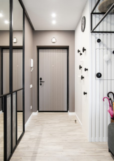 На фото пример того, как можно подобрать цвет для входных и межкомнатных дверей коридора, где они выполнены в одной стилистике, оттенке и одинаково дополнены темными наличниками .