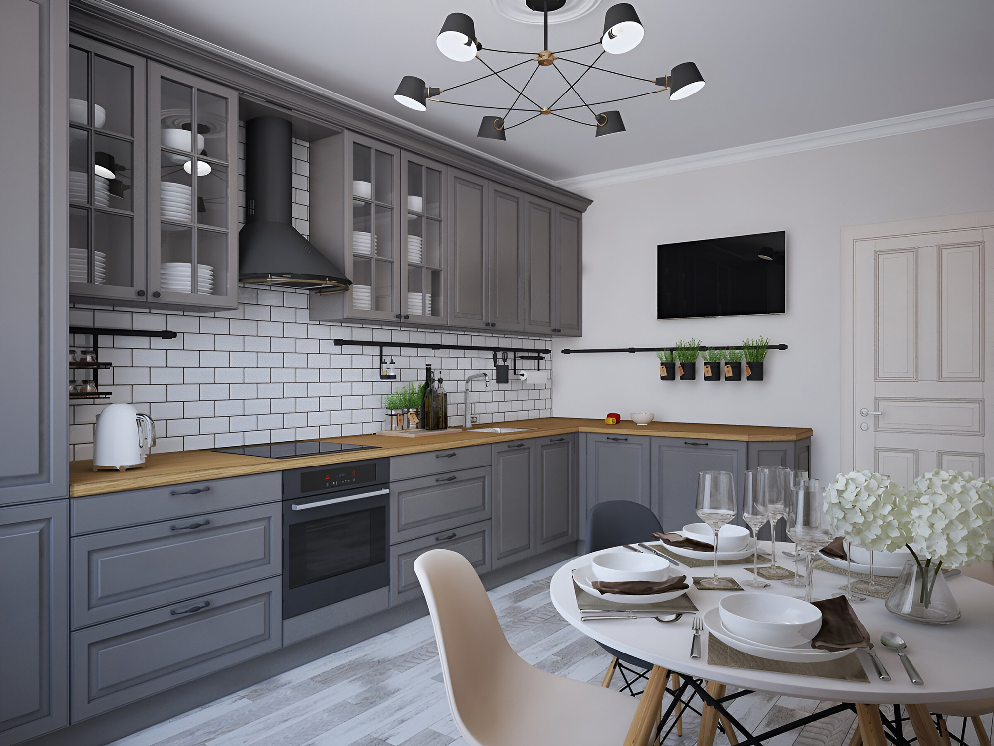 Интерьер кухни в бело сером цвете