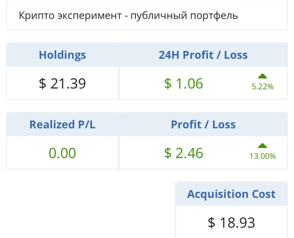 • Profit/Loss - прибыль/убыток за всё время моего крипто эксперимента «Публичный портфель».
