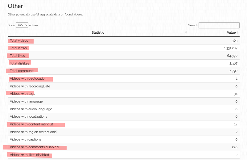 Jika hasil terkait dengan metada tersebut masing kurang memadai, anda bisa klik link yang bertuliskan; 01 : Inspect the metadata for the rest of this channel's videos (ini akan membawa anda ke mode "bulk', tunggu proses 'grabbing' sampai selesai) disana anda akan memperoleh informasi - metadata lebih detail, mulai dari jumlah video, jenis, tags, geo-tags (location), total views, likes/dislikes dll