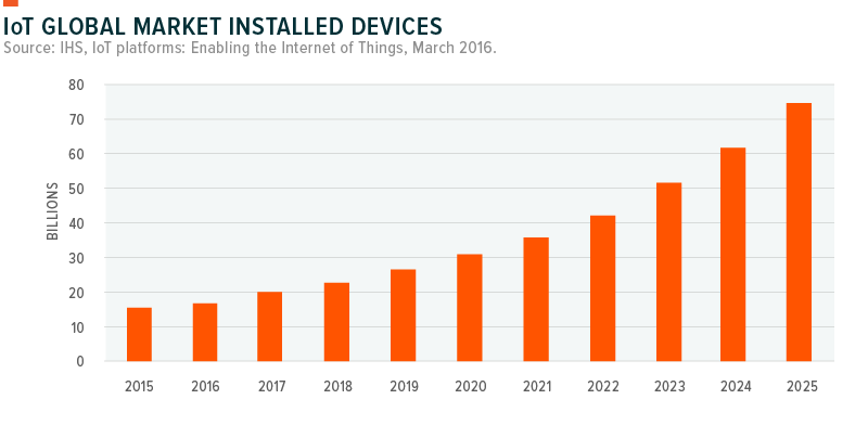 В 2016 году, по оценкам, почти 18 миллиардов устройств обладали способностью отправлять или получать данные. К 2025 году ожидается, что это количество вырастет до 75 миллиардов устройств.