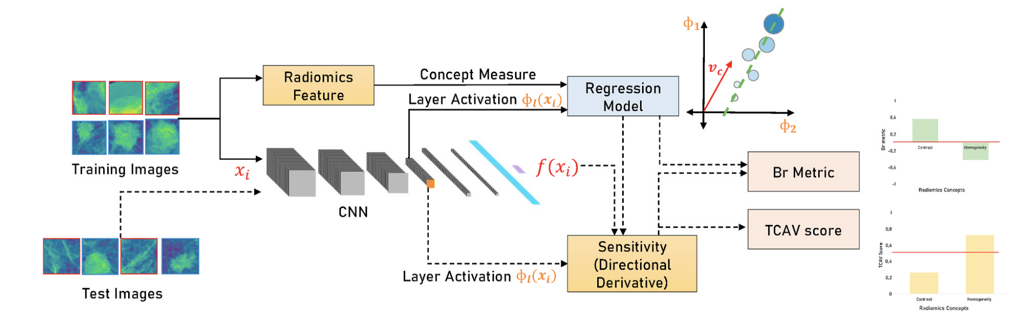 Схожая по духу идея, которая позволяет решить один из недостатков предыдущего метода - вероятное падение метрик. И снова ничего сложного - считаем так называемые радиомические фичи объекта (как базовые, характеризующие форму или размер, так и специфические для задачи), а затем строим модели, которые пытаются предсказать значение каждой фичи по репрезентациям из нашей нейронки. С помощью этих моделей можно для каждого входного изображения оценить чувствительность конечного предсказания к значениям тех или иных радиомических фичей. Подробности можно узнать в этой статье и в этой.