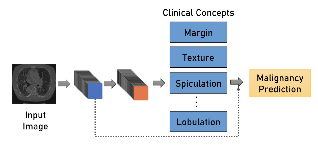 Суть этого метода достаточно проста, но при этом привлекательна. Вместо прямого предсказания класса RoI (Region-of-Interest) с помощью сетки, будем сначала определять его различные свойства, связанные с текстурой, формой, плотностью относительно окружающей ткани, размером. А уже на основе этих свойств мы можем на основе правил или с помощью простой линейной модели определять конкретный тип объекта - например, злокачественный он или доброкачественный. Звучит крайне приятно - для каждого предсказания мы можем объяснить врачу, почему оно именно такое. Метод, конечно же, не идеален: