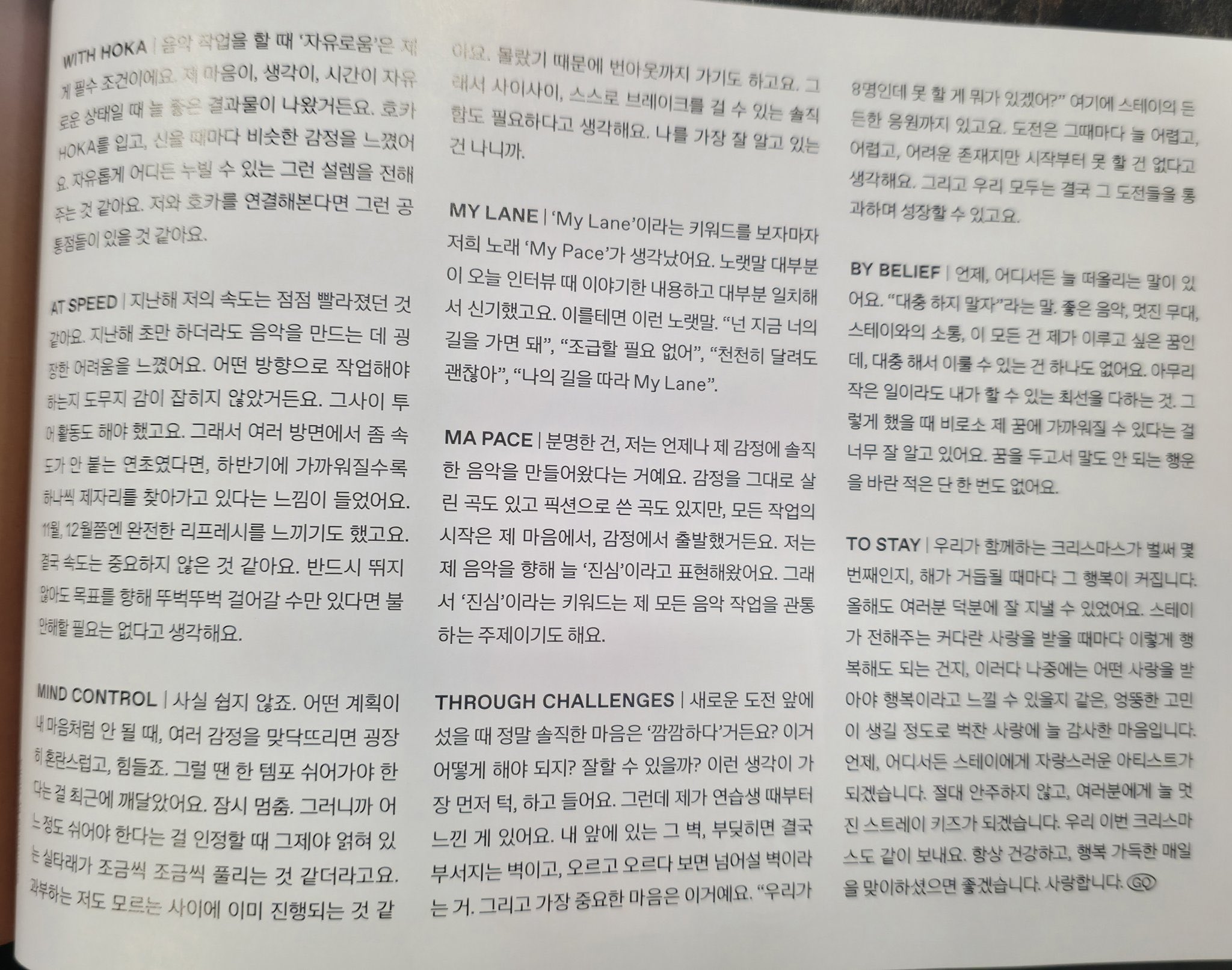 Хан: Когда я стою перед новым вызовом, моё самое первое чувство — это «полная темнота», понимаете? «Как мне это сделать? Получится ли у меня хорошо?», таккие мысли приходят первыми, все сразу. Но есть ощущение, которое я испытываю со времён обучения. Та стена перед тобой — если биться о неё, в конце концов она рухнет, и если продолжать карабкаться и карабкаться, её можно преодолеть. И самое важное в этом мышлении вот что: «Нас восемь, так что все же возможно?» Помимо этого, есть ещё и крепкая поддержка STAY. Испытания каждый раз трудны, трудны и трудны, но я не думаю, что есть что-то изначально невозможное. И в конце концов, пройдя через эти испытания, все мы можем вырасти.