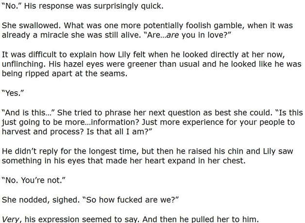 I just shared this excerpt on Twitter. This is the love confession scene that takes place directly after the 2 protagonists have tried to kill each other.