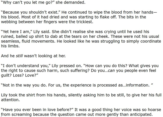— Я тебя не понимаю, — продолжила настаивать Лили. — Как ты можешь таким заниматься? Кто дал тебе право приносить столько вреда? Столько страданий? Ты… Такие как ты вообще чувствуют вину? Горе потери? Любовь?