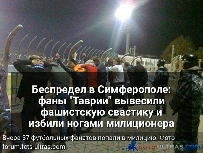 - (Ф.) “Таврия” сейчас играет в Бериславе Херсонской области. Финансовое положение аховое. Человек, который вызвался финансировать клуб, не может (или не хочет) это делать. По поводу невыезда было сказано: "все равно матч в Краматорске ничего не решает, поэтому нет смысла ехать". Банально сэкономил, записав черную страницу в историю команды. Человек не отдает себе отчет, что он руководит первым чемпионом Украины, третьим самым титулованным клубом страны и символом украинского Крыма. Плохо то, что оставить клуб или найти других собственников Коновалов не хочет. Полагаем, это связано с ожидаемым строительством нового стадиона в Бериславе на деньги УЕФА и ФФУ. Еще с прошлого года мы, как движ, начали активно высказывать наше недовольство положением в команде. На выездном матче в Херсоне Коновалов бегал от нас по стадиону, но после матча таки удалось с ними поговорить без каких либо результатов.