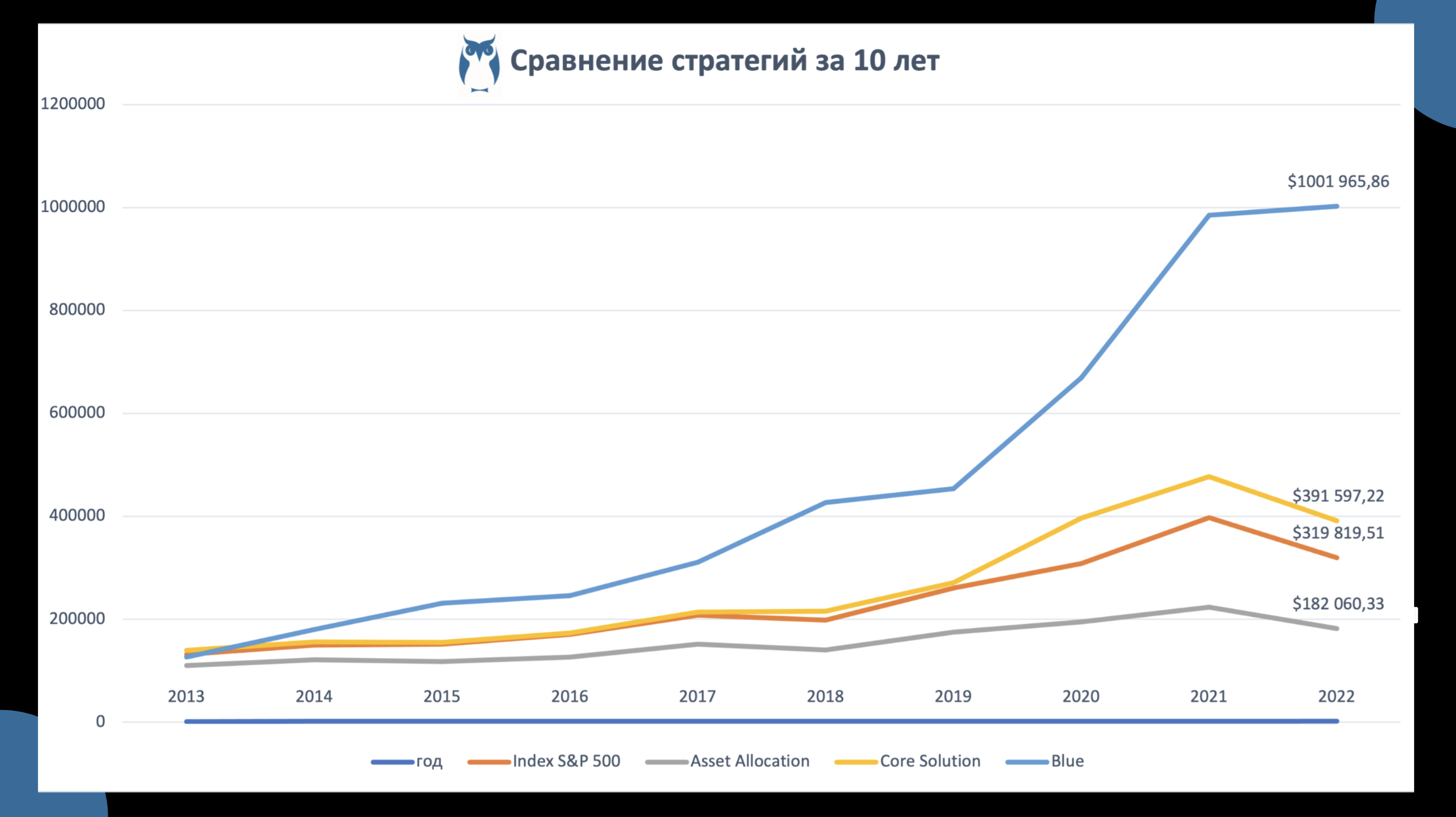 В результате, если бы мы 10 лет назад вложили $100т. в каждую стратегию, то к январю 2022 года у нас были бы следующие суммы на счетах: