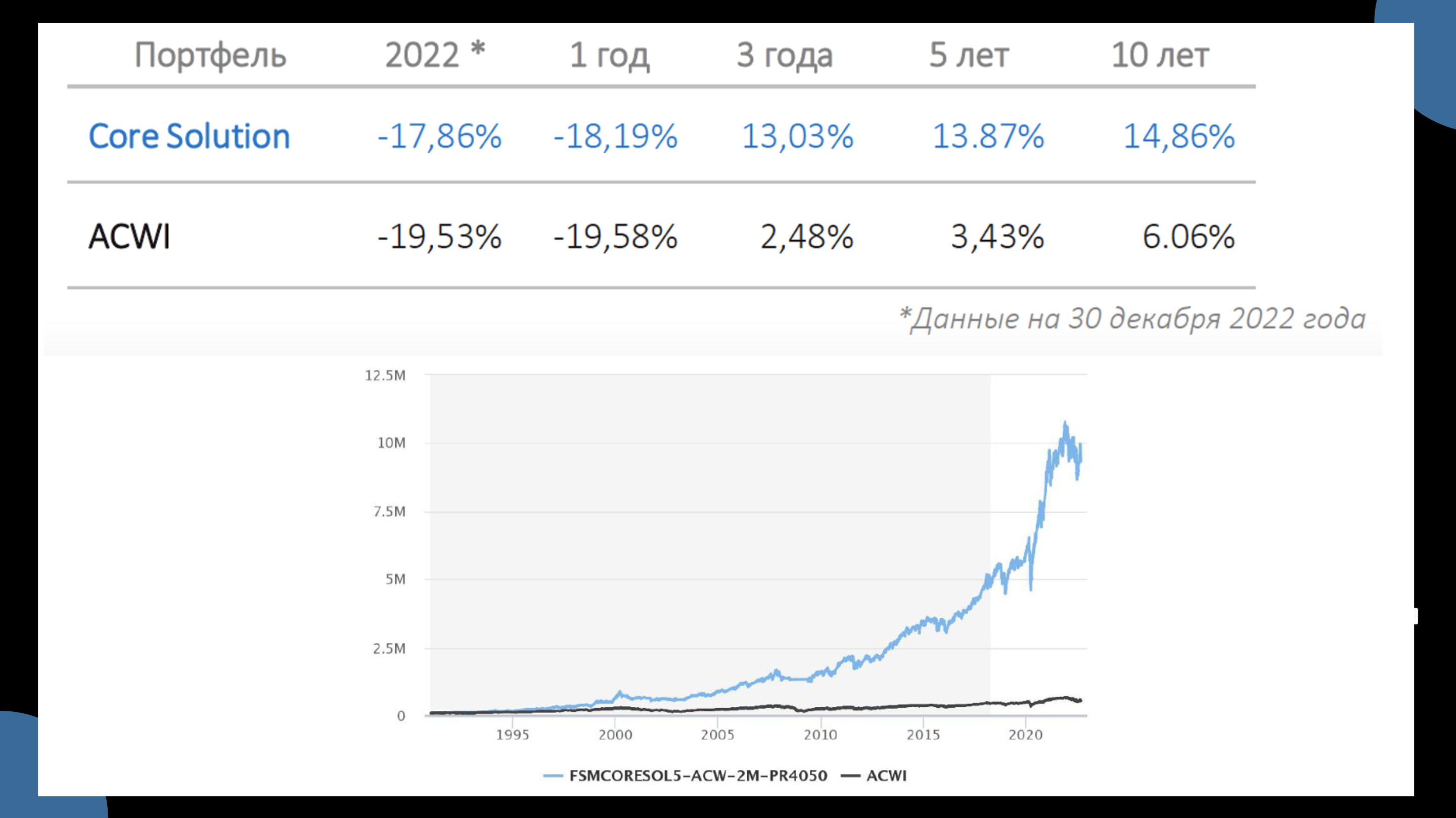 Поскольку в основе стратегии лежит всё тот же портфель - особого волшебства от нее ждать не стОит: уж если рынок падает, то и Core Solution, скорее всего, покажет “минус”. Именно поэтому за 2022 г. доходность составила минус 17,86%. Эти цифры, конечно, превосходят бенчмарк стратегии - Индекс ACWI (All Country World Index - мировой рынок акций), но всё-таки наверняка далеки от тех, которые хочется видеть инвесторам.