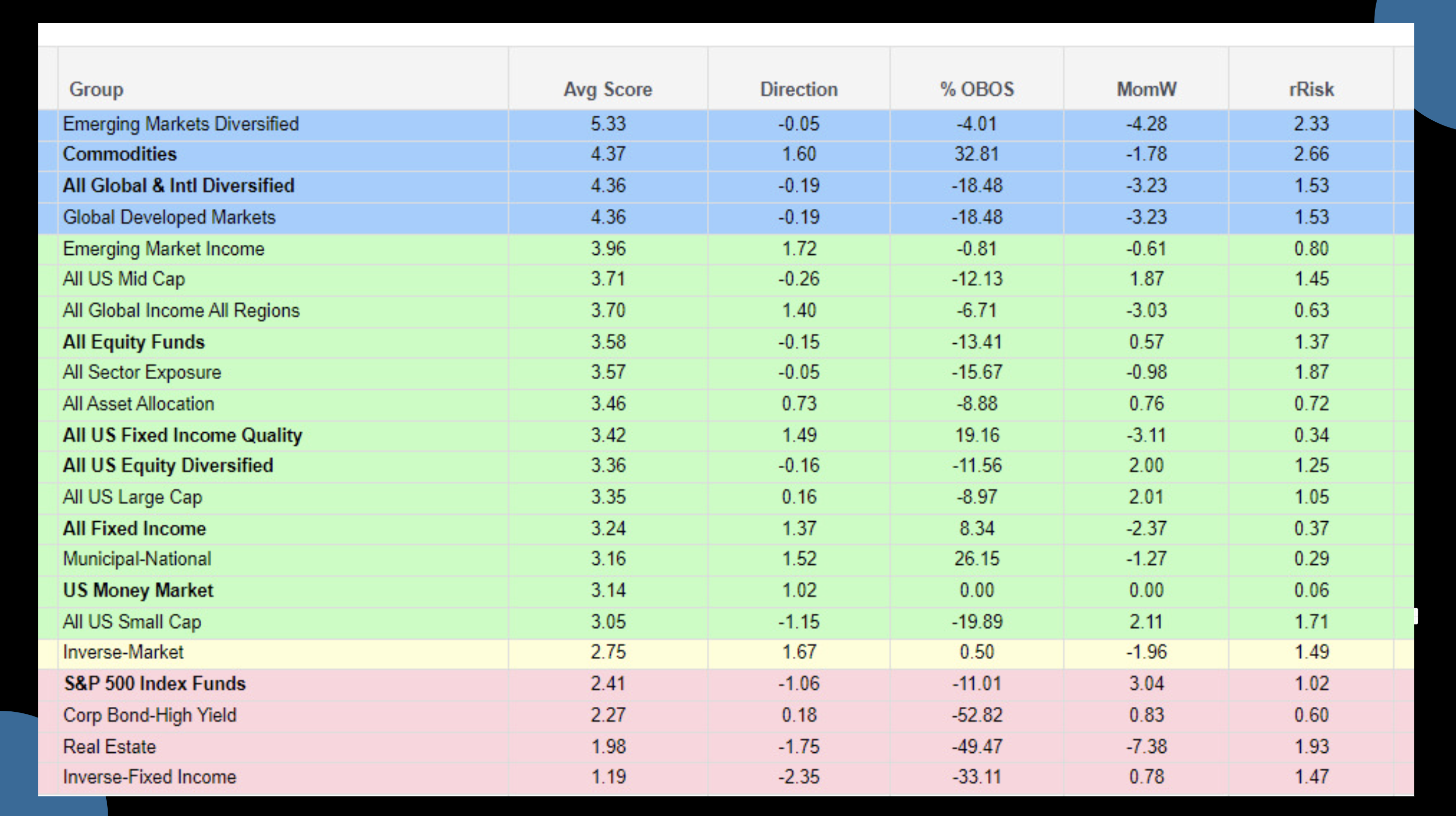 Суть этого активного управления в том, что берется аналитика от Nasdaq, в которой голубым цветом помечаются сектора с техническими и фундаментальными показателями для краткосрочного роста. Собственно, именно в этих “голубых” лидеров в количестве (обычно) 6-8 штук и происходят вложения, и именно за счет этого стратегия и получила своё название.