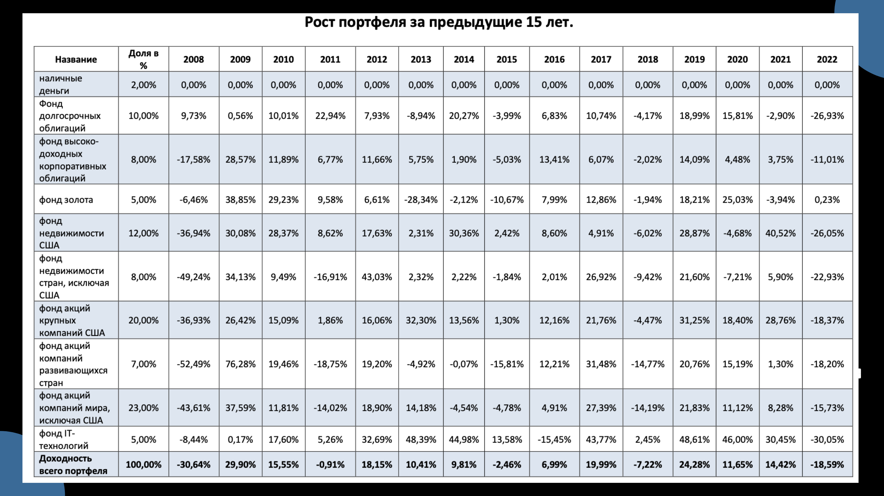 В этой таблице наглядно показана доходность различных индексов (активов) на протяжении последних 15 лет.