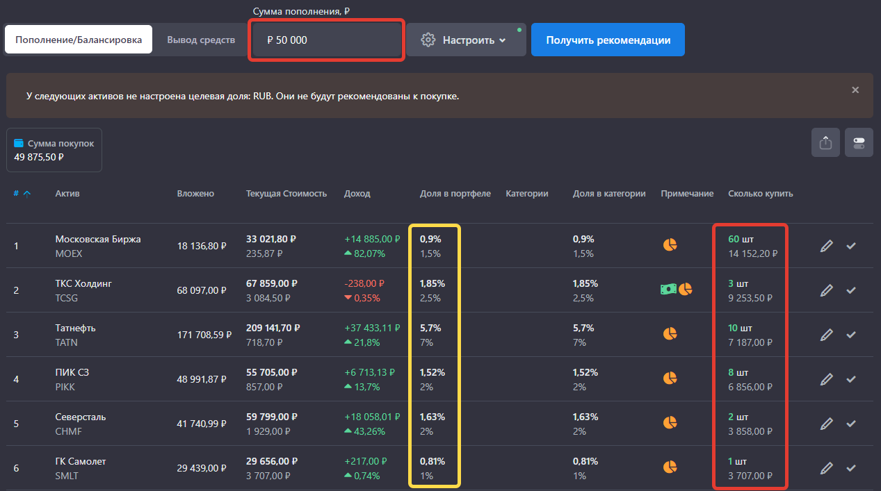 Я использую сервис «снежок» для учета инвестиций, где есть отличная функция «Рекомендации». Я вбиваю сумму, на которую планирую купить акций, а сервис распределяет эту сумму и подсказывает акции каких компаний и в каком количестве мне нужно докупить в портфель, чтобы максимально приблизить веса компаний к целевым, то есть к тем, которые я самостоятельно задал ранее.