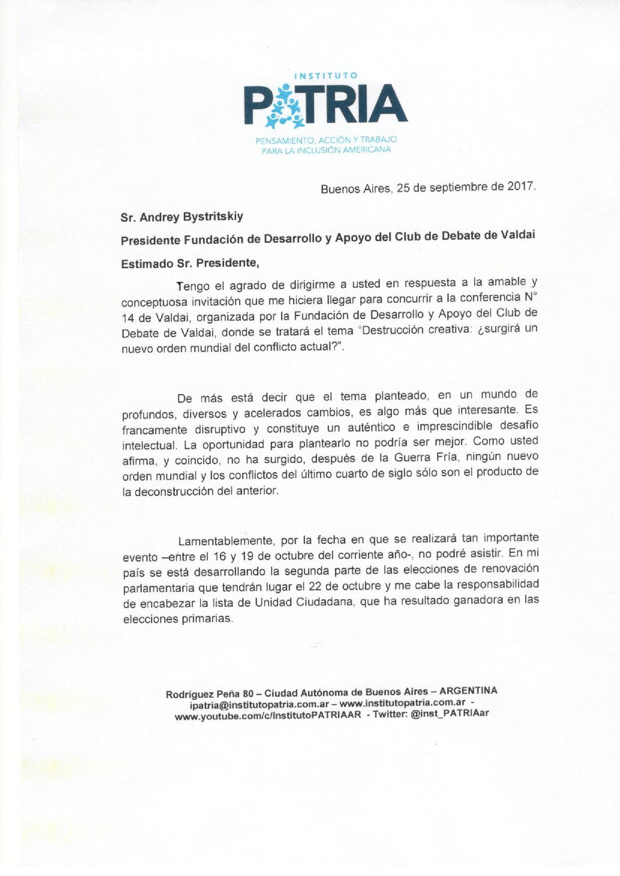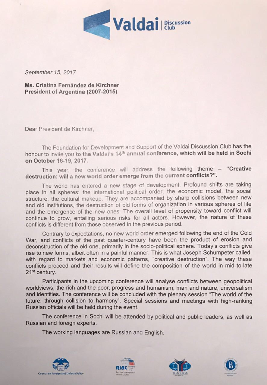 Como ven, una propuesta más que interesante, que debo declinar por la coincidencia de fechas con nuestras elecciones de renovación parlamentaria. Aquí también mi respuesta, y desde ya envío mi agradecimiento por la invitación al Club Valdai de Rusia, así como mi afecto y admiración por ese país y mi respeto por quien lo preside.