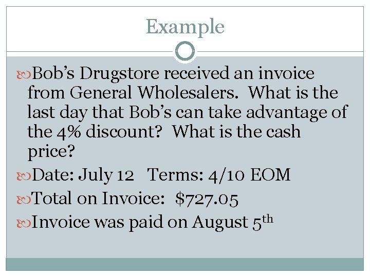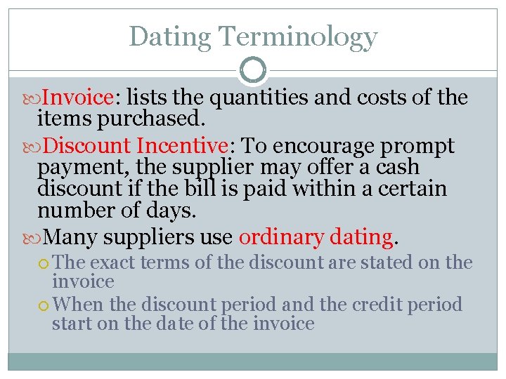 When you place your order for merchandise (inventory) in your store, it will come with specific terms for payment of the invoice . These terms are often referred to as " dating ." An invoice will contain the time frame in which you must pay the bill . For example, Net 30 means you have 30 days to pay the bill or 30 days of dating .