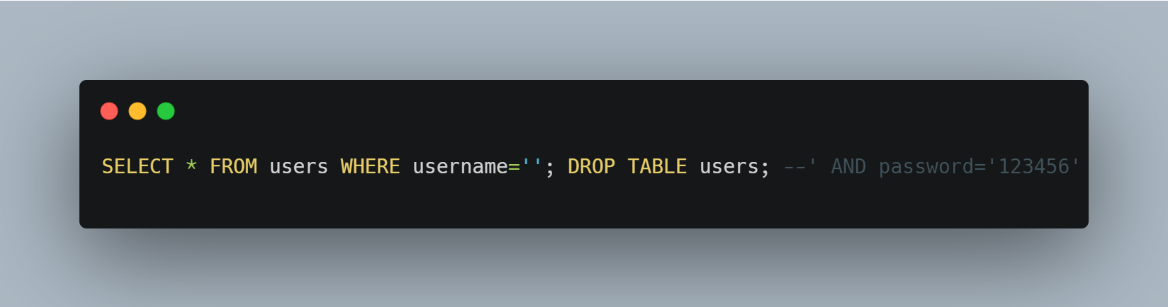 En este caso, el valor de username se establece en "'; DROP TABLE users; --", que es una cadena de texto que incluye una consulta SQL maliciosa que intenta eliminar la tabla users. Si un atacante malintencionado ingresa este valor como nombre de usuario en una aplicación vulnerable, la consulta SQL generada será: