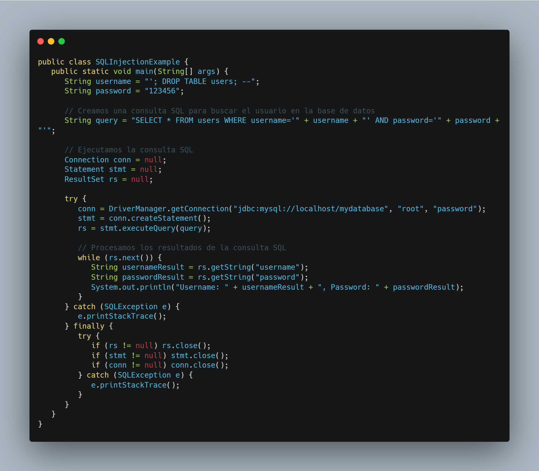 A continuación, se presenta un ejemplo de inyección SQL en Java: