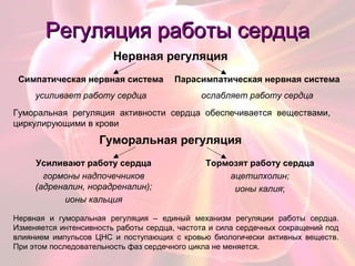 Эти нервы регулируют работу сердца . Кроме того, на работу сердца влияет гормон надпочечников — адреналин, который с кровью поступает в сердце и усиливает его сокращения . Ион кальция абсолютно необходим для нормального процесса сокращения миокарда (кальций увеличивает сократительную способность сердца) .
