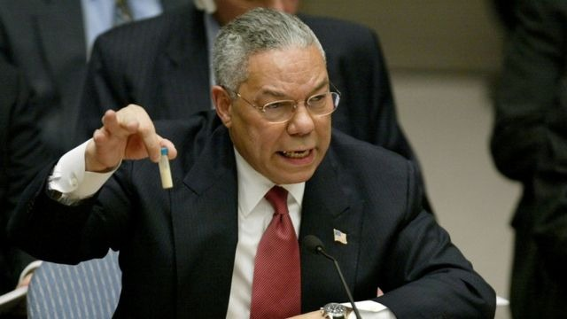 A despecho de esto, en febrero de 2003, el Secretario de Estado de EEUU, Colin Powell, acusó públicamente en una sesión del CS de la ONU a los dirigentes iraquíes de fabricar armas de destrucción masiva. En calidad de prueba irrefutable mostró una probeta con polvo blanco que, supuestamente, contenía ántrax descubierto en Iraq.