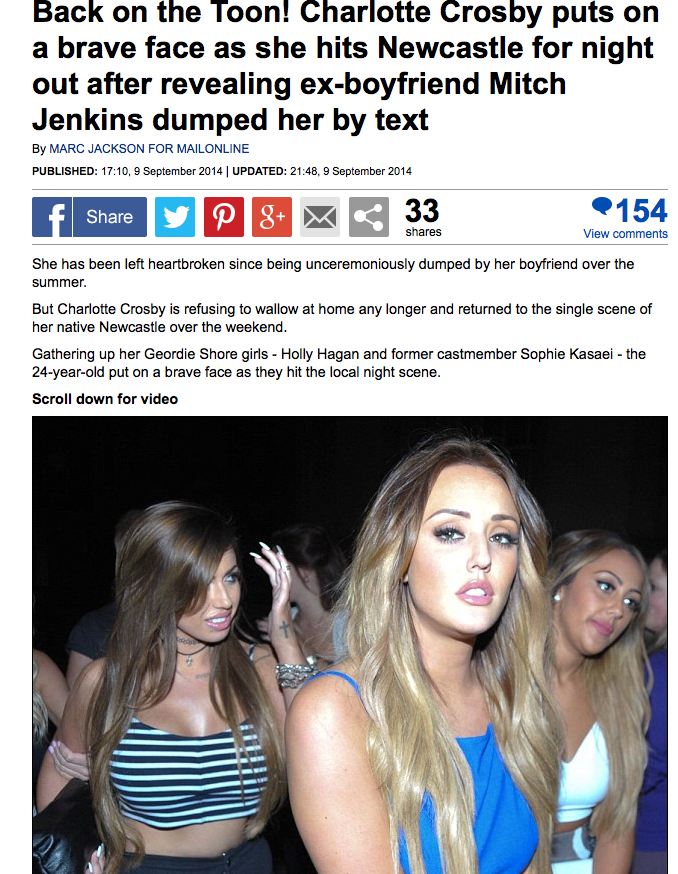Geordie Shores Charlotte Crosby has revealed that she is now single after boyfriend Mitch Jenkins dumped her by text . by Fiona Day | . Posted on 03 09 2014 . In an interview with a UK newspaper, the 25-year-old spoke out about her heartache . " I never wanted to end things .