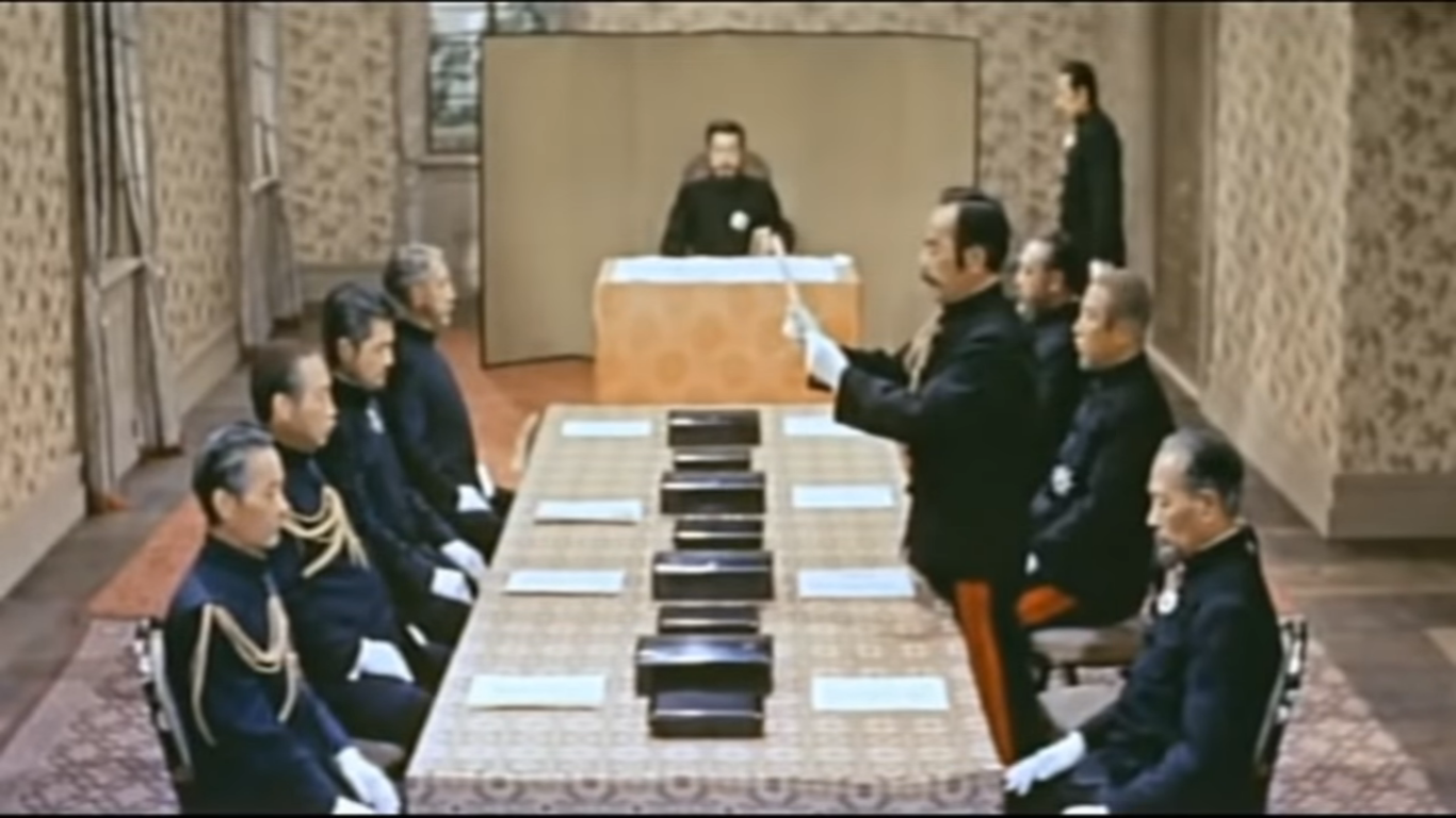 И собственно, в кругах японской знати пришло осознание, что государственную систему нужно в прямом смысле сносить и строить заново. Период с 1868 по 1889 принято называть реставрацией или революцией Мэйдзи. По посмертному имени императора. Сёгун в этот период потерял власть. Во все страны в это время были отправлены миссии с целью сбора информации о политическом устройстве, общественной структуре, армии, истории, проводимых реформах. На основе полученных данных с 1868 года начинаются радикальные преобразования политического устройства. Производится разделение власти на ветви, для чиновников вводятся выборы. Были сформированы министерства. За последующие годы государственный аппарат приобрел западные черты, а задача императора свелась главным образом к надзору за действиями всех органов власти. Однако реформация проходила не совсем гладко.
