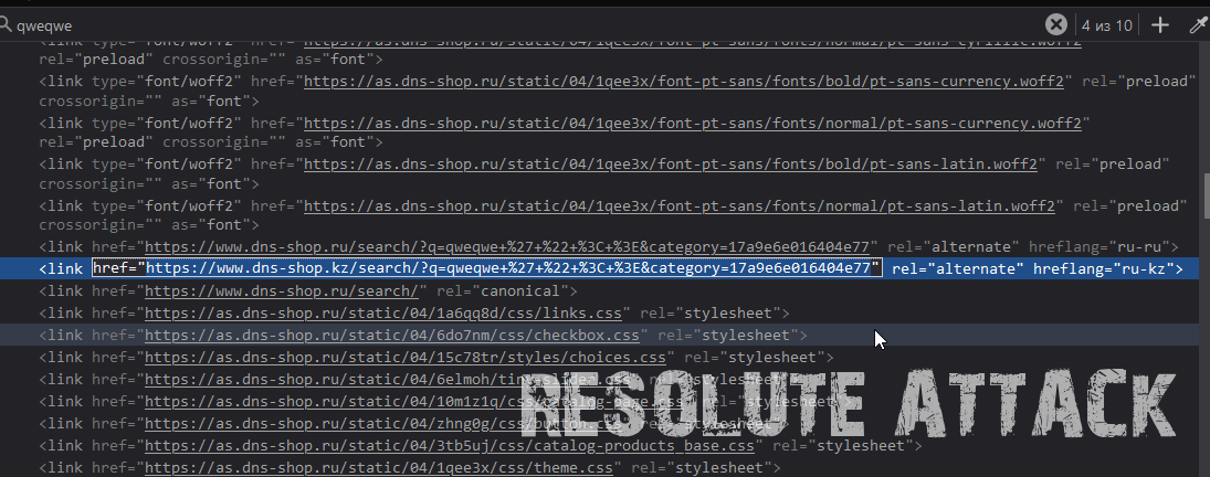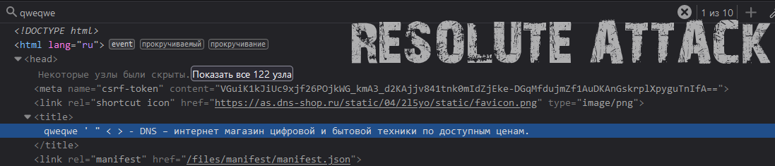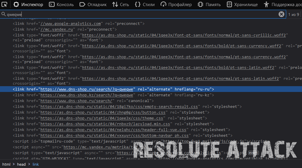 Мы видим то что наша строка qweqwe из поля для поиска попала в параметр q и также она попала на страницу 9 раз, то есть у нас есть 9 мест на странице где разработчик мог не добавить защиту от данной уязвимости.