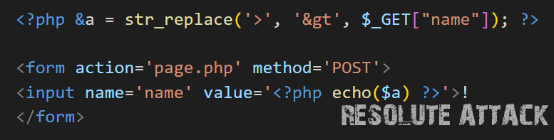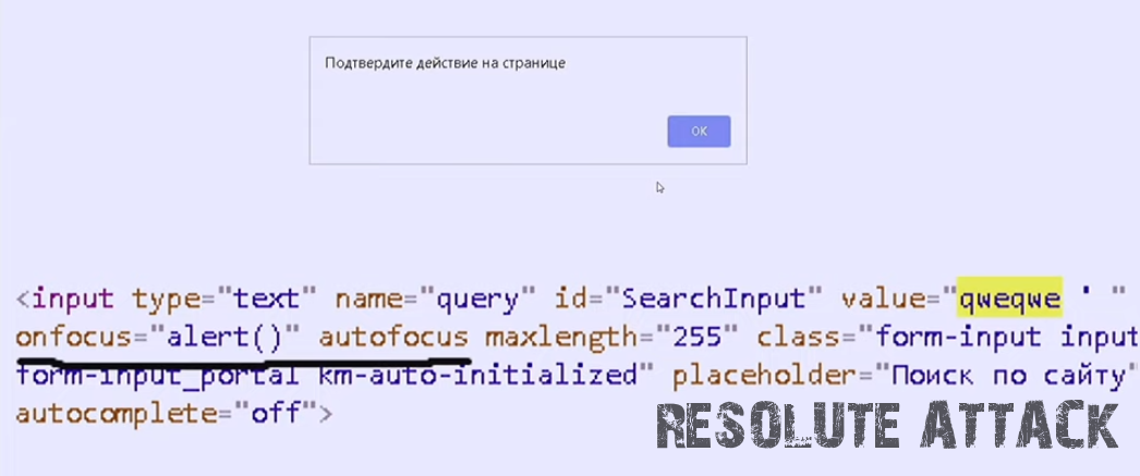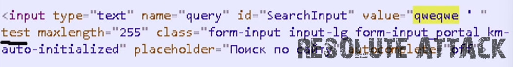 Наш предыдущий вариант не сработает, потому что нужно закрыть атрибут, но мы закроем не только атрибут, мы также закроем и тег input и встроим свой script который отрендерится браузером: