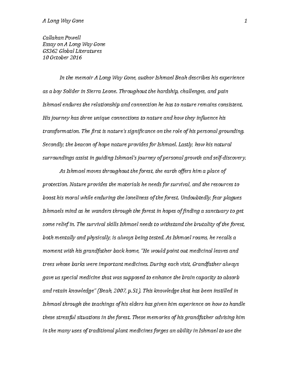 Notes: A Long Way Gone - Ishmael Beah Essay . Chapter 2 notes The imagination in this chapter is a jarring contrast to chapter one when Ishmael played music and went to school and had a loving household . It is filled with memories and dream imagination that are dismaying to both Ishmael and the reader . Chapter 3 notesThis chapter is filled . . .